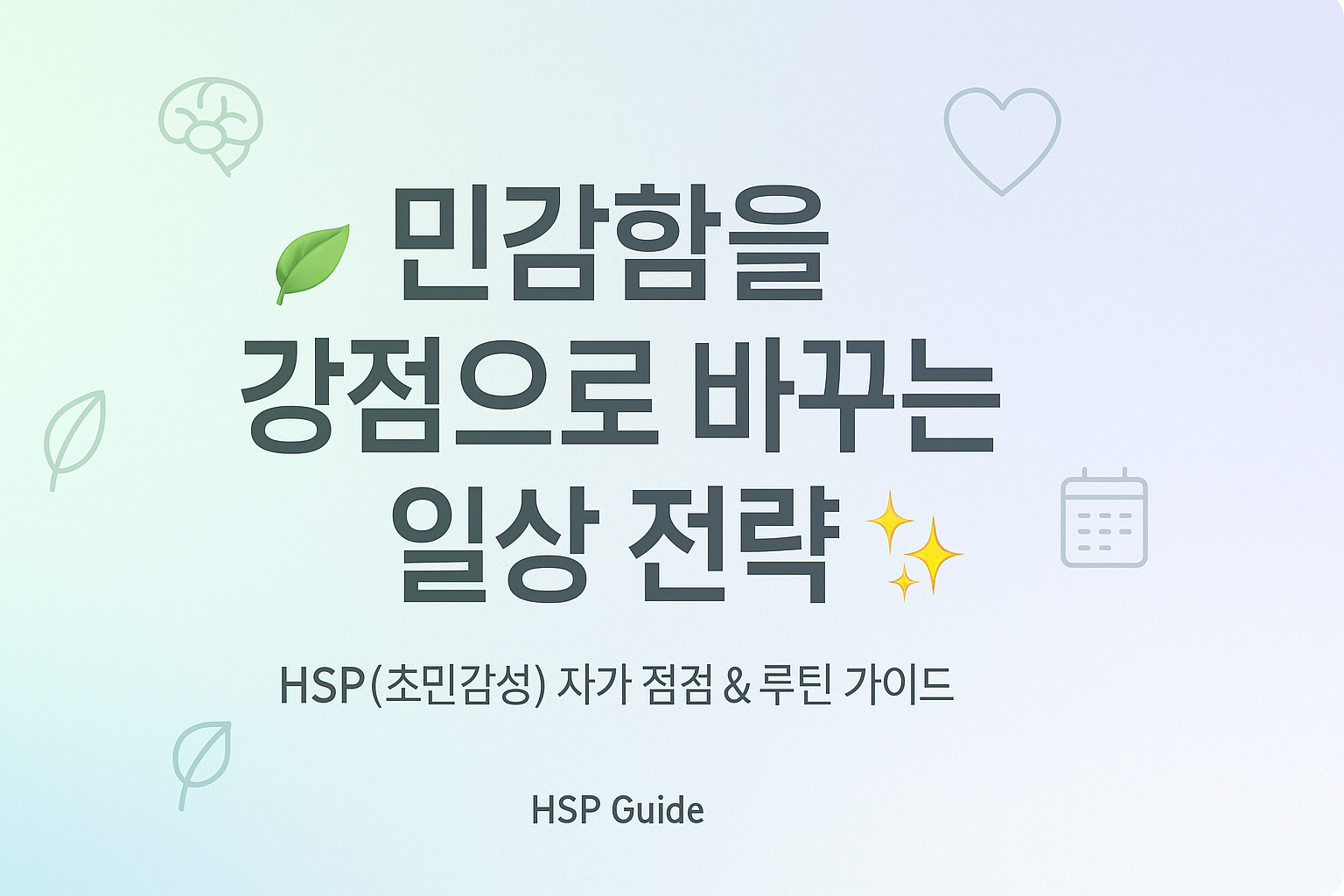 아래에서 HSP(Highly Sensitive Person)를 보다 더 쉽게 이해하고, 자가 점검 → 일상 루틴까지 읽어 보시면 도움이 되실 겁니다. 당신의 예민함을 강점으로 만들어 보는 것은 어떤지요? 🙌